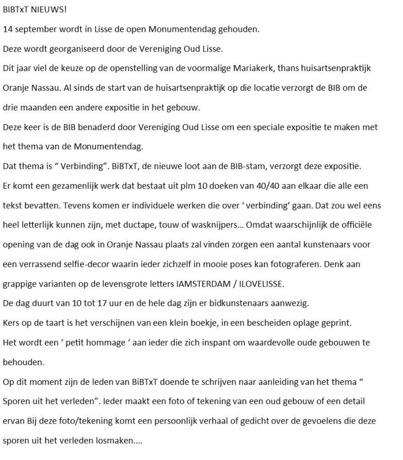 Jenny de Bode en Klaar Wolff hebben BiBTxt ( bibtekst) bedacht als een soort nieuwe loot aan de BiBstam. De bedoeling is dat teksten, gedichten, verhalen gaan leiden tot kunst. Bestaande teksten of door BIB leden geschreven. Tevens wil BiBTxT onderzoeken wat de combinatie tekst+beeld , taal& teken, kan opleveren. Er hebben zich zo’n tien leden opgegeven voor de aftrap in maart.