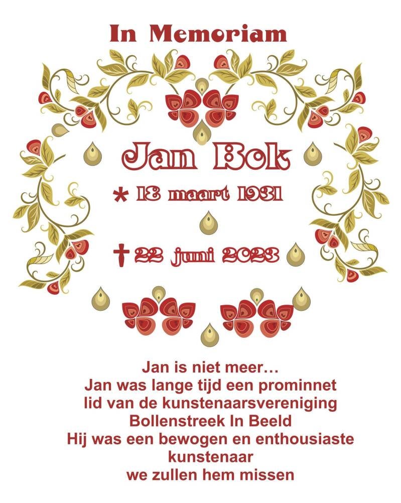 De laatste jaren herinneren we Jan vooral van de teksten waarmee hij ons een hart onder de riem stak. Taalgevoelig was hij en via gedichten liet hij ons en de wereld weten hoe hoopvolheid eruit kan zien. Tevens liet hij ons steeds weten dat het nog steeds heel belangrijk was voor hem om deel uit te mogen maken van de club creatievelingen die de BIB vormt. De laatste ALV konden we hem nog tot ‘ lid van verdienste’ maken. Op zijn rouwkaart staat:’ ik heb geleefd’. Ja, dat hebben we geweten! Gelukkig hebben we dat mogen meemaken. En gelukkig heeft Jan heel lang geleefd. Dank aan Trudy die hem zo liefdevol nabij was zeker die laatste jaren, maar vooral dank aan Jan. Jan, een lieve laatste groet van alle BIBleden…