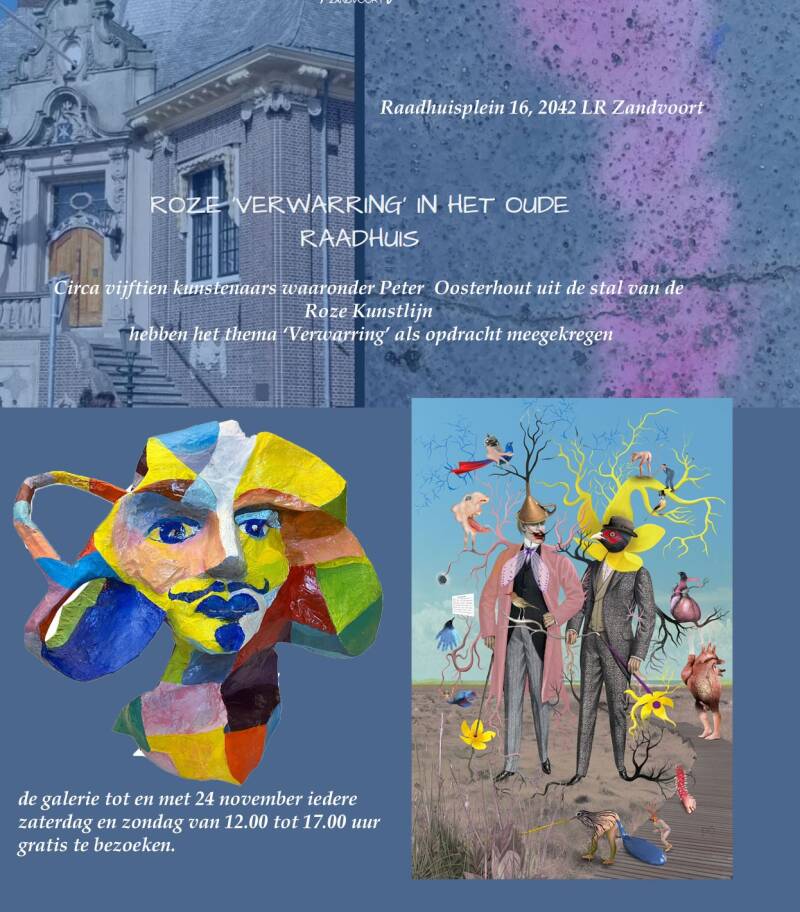 Met een collage en een kartonnen sculptuur (1 sculptuur, 2 gezichten: voor en achter) doet Peter Oosterhout mee met de expositie ‘verwarring’ tijdens de roze kunstlijn in Zandvoort. Te zien vanaf vandaag 25 oktober (opening 16 uur) t/m 24 november.